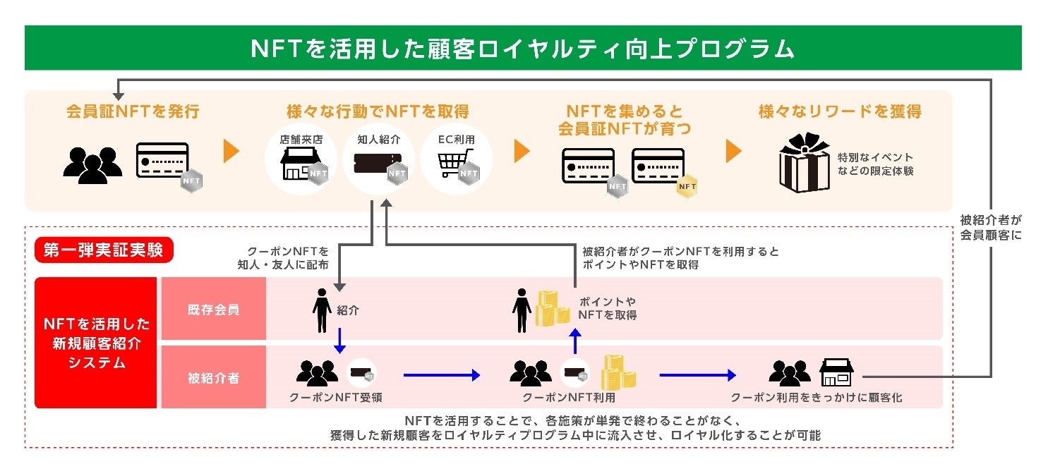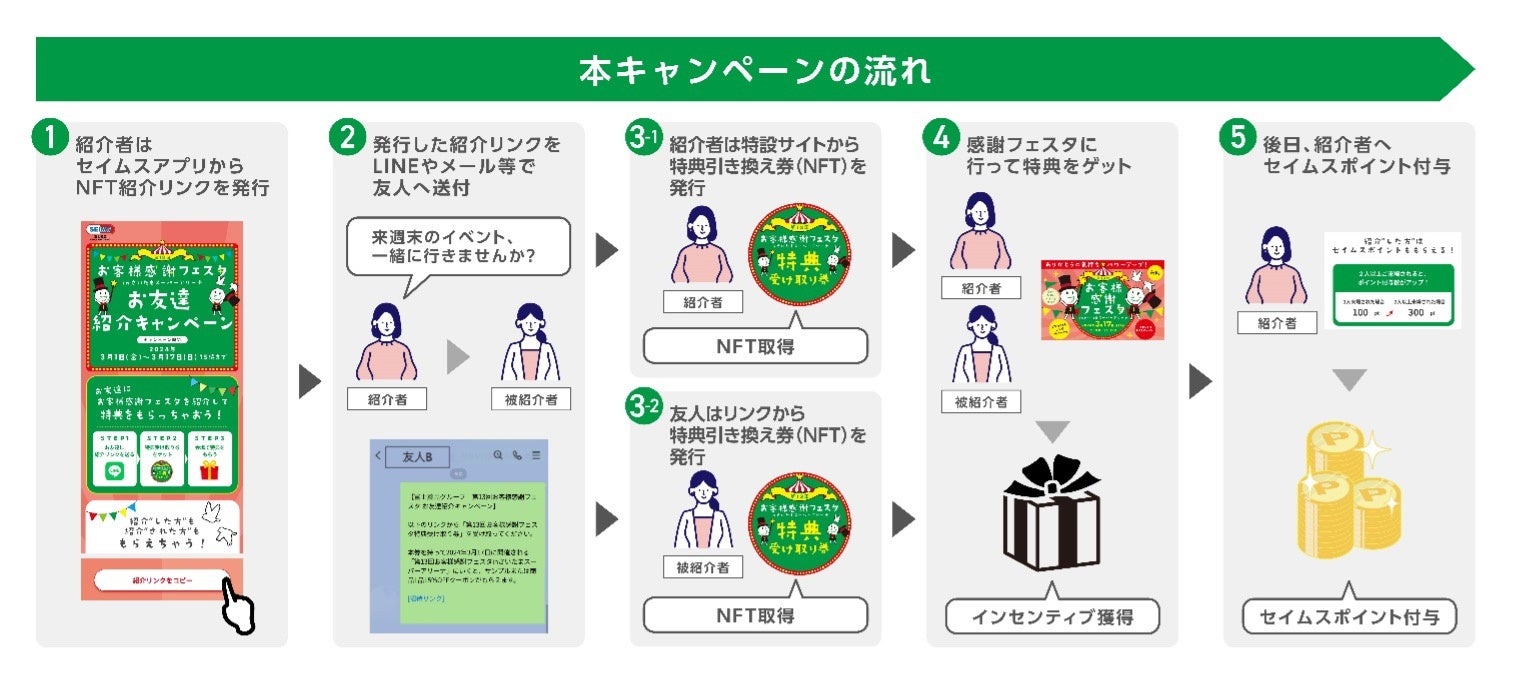 本プログラムは、ProofXと博報堂が共同でサービス企画構想や体験設計を行っています。今回の第一弾実証実験は、本プログラムの新規顧客紹介システムと、富士薬品グループが展開するドラッグストア「セイムス」のモバイルアプリ「SEIMS公式アプリ」を連携し、アプリ会員様が知人・友人に紹介リンクを送付することができます。紹介者・被紹介者ともにお客様感謝フェスタ会場にて特典がもらえる引き換え券(NFT)を取得することができる仕組みで、店舗送客とSEIMS公式アプリ新規会員登録促進を目指します。