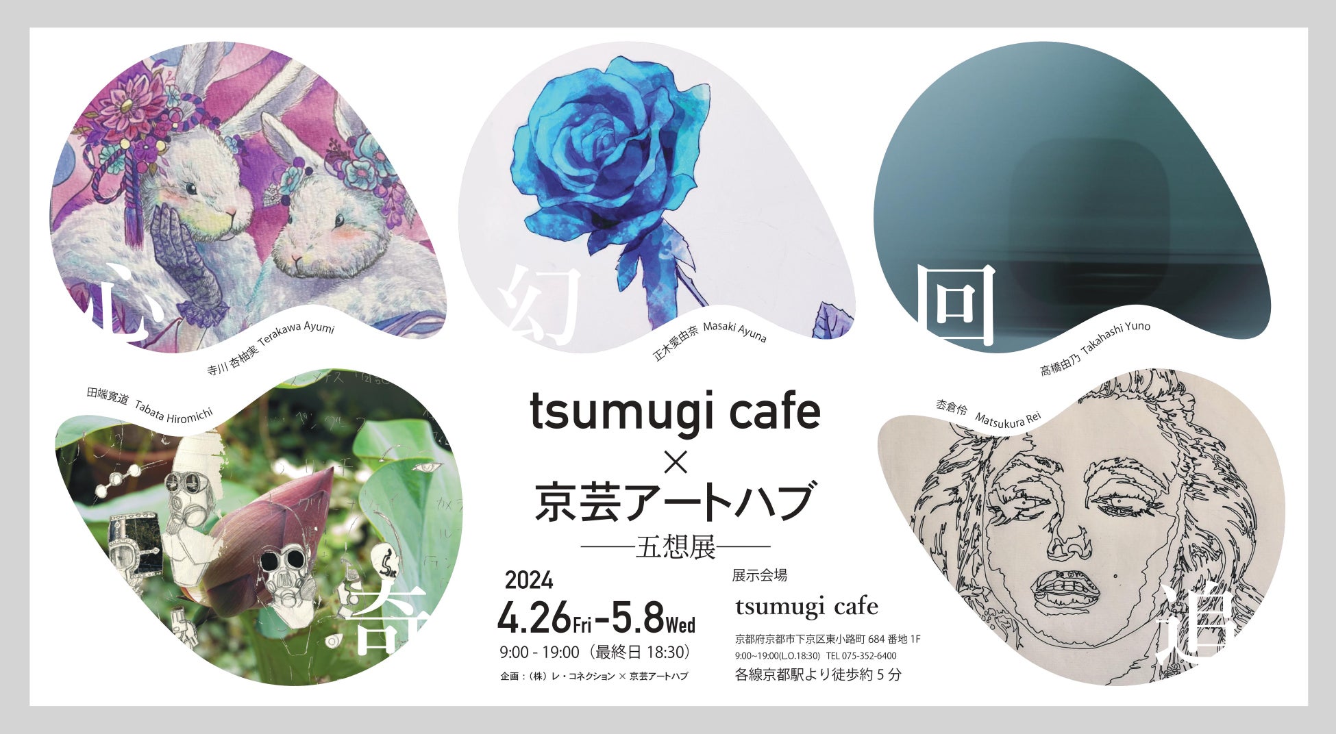 【企画概要】 京都市立芸術大学 有志 芸術活動サークル「京芸アートハブ」学生作品展示 ◆テーマ:「五想展」… 回想・追想・奇想・幻想・心想 ◆展示期間:2024年4月26日(金) ~ 5月8日(水)まで 9時-19時(最終日18時30分) ◆展示場所:tsumugi cafe 店内 ※展示作品をご覧になる方は店内にてワンドリンクのオーダーお願いします |