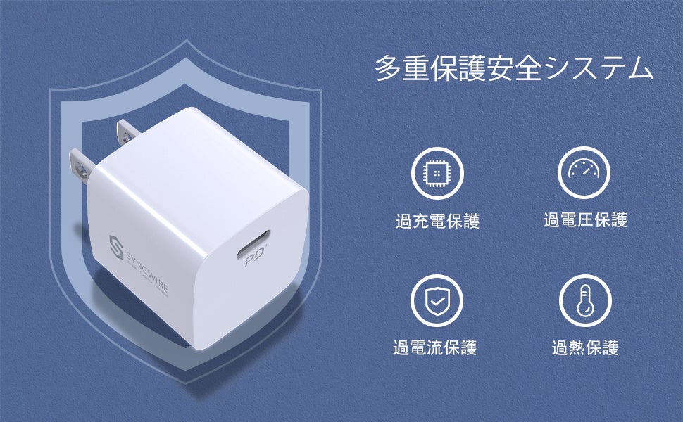 【安全な保護機能搭載】コンパクトかつパワフルな製品でありながら、Syncwire独⾃の多重保護回路により過度な温度上昇の抑制や過充電、漏電、ショー トを防⽌し安全にご利⽤が可能です。
