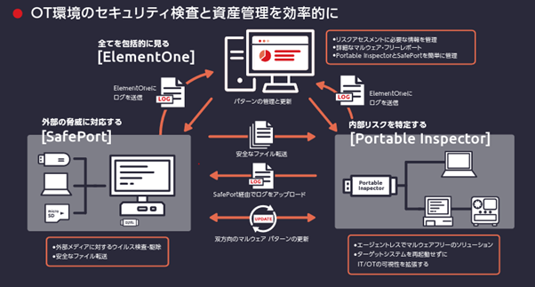 機器や端末などの資産にソフトウェアのインストール不要で、マルウェアスキャンのステータスをLEDで視覚的に確認できるPortable Inspector、直観的な操作でリムーバブルストレージのマルウェア対策ができるSafe Port、そしてElementOneを用いることでPortable InspectorやSafe Portで収集した情報の一元管理を実現します。