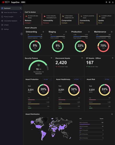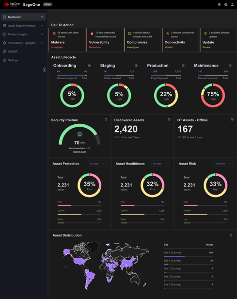 SageOneはOTセキュリティのレジリエンスを強化するプラットフォームです。TXOne全てのソリューションを1つのダッシュボードで管理することで、脆弱性の管理や、資産管理、リスク分析、インシデント発生状況の確認など、OTセキュリティ全体の包括的な可視性を提供します。