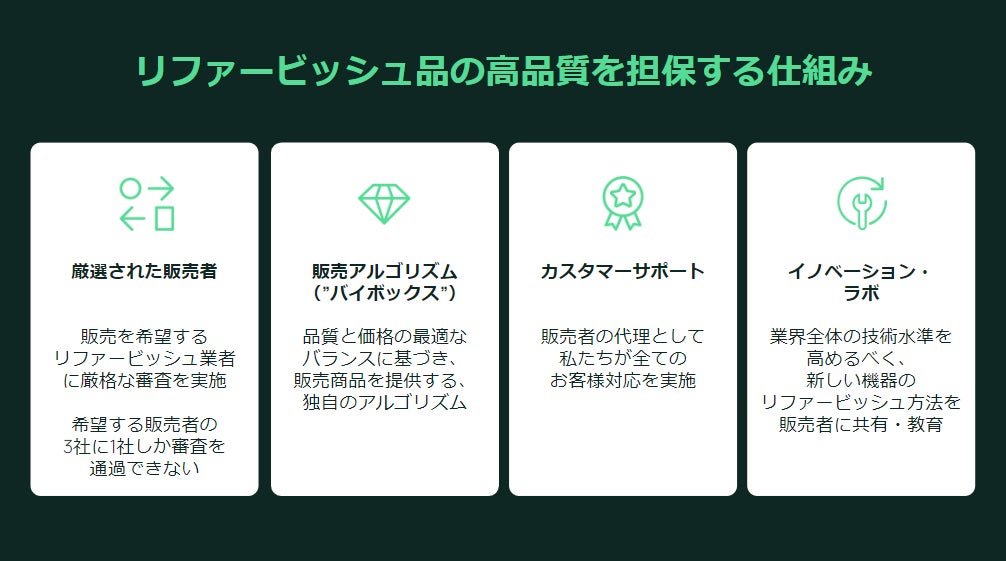 販売者と消費者の間の単なるマーケットプレイスではなく、お客様が高品質な商品を購入する一連の体験が素晴らしいものになるよう、全てのプロセスに関わっています。希望する販売者の3社に1社しか通過できない厳格な審査、最適な品質と価格を実現する独自の販売アルゴリズム、1年間の動作保証と30日間の返金保証、新しい機器のリファービッシュ方法を販売者に共有・教育するイノベーションラボといった独自の手順で高品質なリファービッシュ品の提供を担保しています。