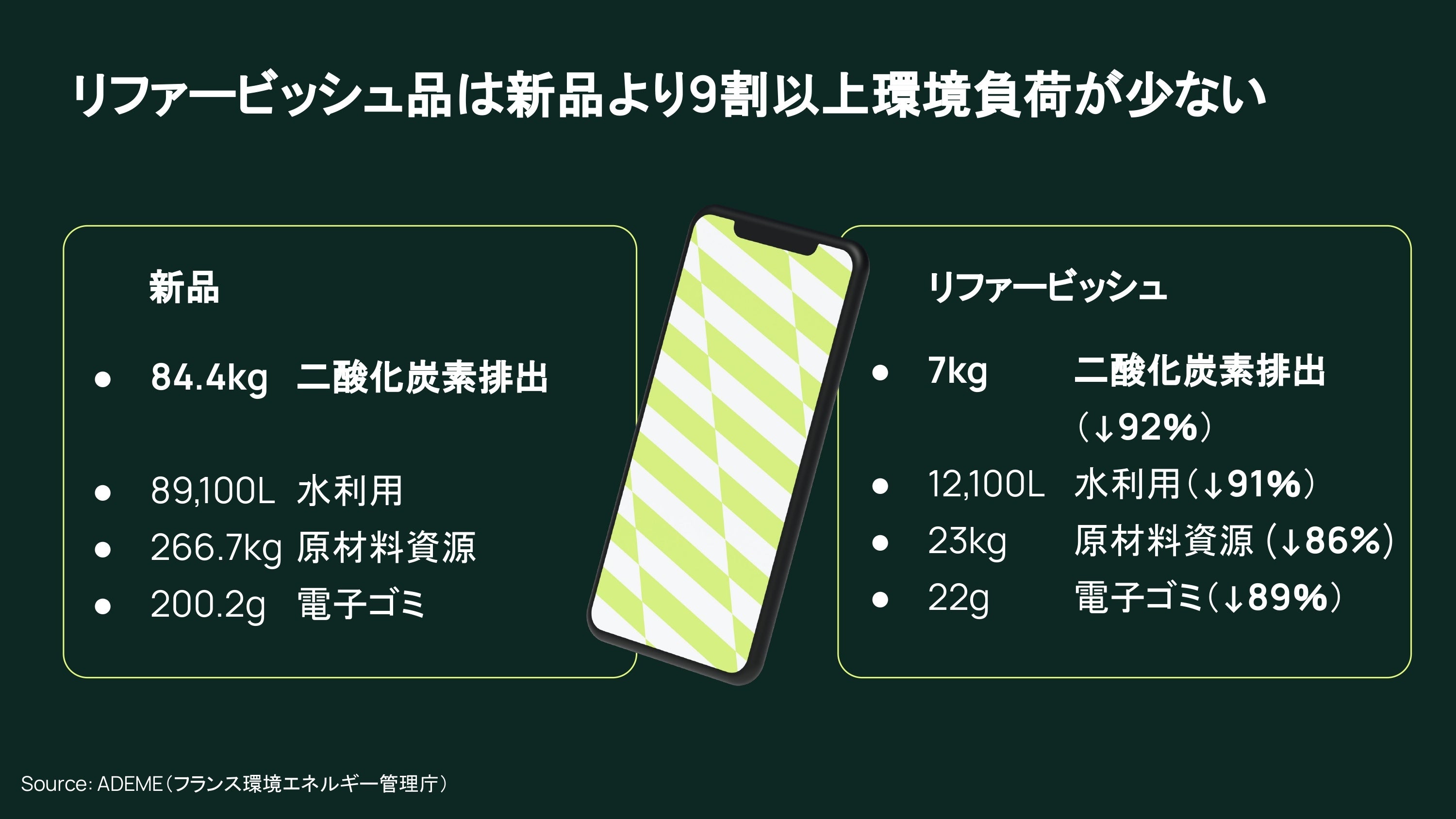 一般的にリファービッシュ品は、回収された中古品を検査・クリーニングし、必要であれば修理するため、新品と比較すると環境負荷が低いです。フランス環境エネルギー管理庁によると、リファービッシュ品は、新品に比べて二酸化炭素排出量、水利用、原材料資源、電子ゴミのカテゴリーにおいて、約9割以上環境負荷を削減できます。Back Marketは2023年に二酸化炭素排出3.8億kg、水利用4,105億L、原材料資源13億kg、電子ゴミ151万kgの削減・節約に成功しており、環境負荷低減に大きく貢献することができています