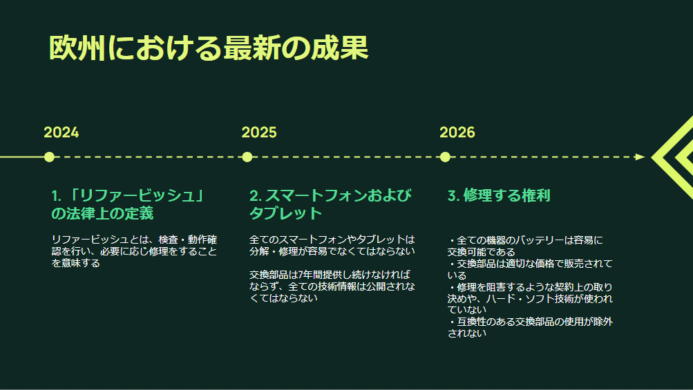 現在、製品をより長く使い続けることを可能にする修理する権利の法制化が世界中で進んでいます。Back Marketは、様々な電子機器の技術的な情報へのアクセスを可能にするべく、ヨーロッパで修理する権利の法制化に取り組んでいましたが、アメリカでもその動きを急速に広めています。そして日本でも注目を集め始めていることを受け、日本でのさらなるリファービッシュ品拡大に向けて、日本でも修理する権利のあり方を検討してまいりたいと思います。