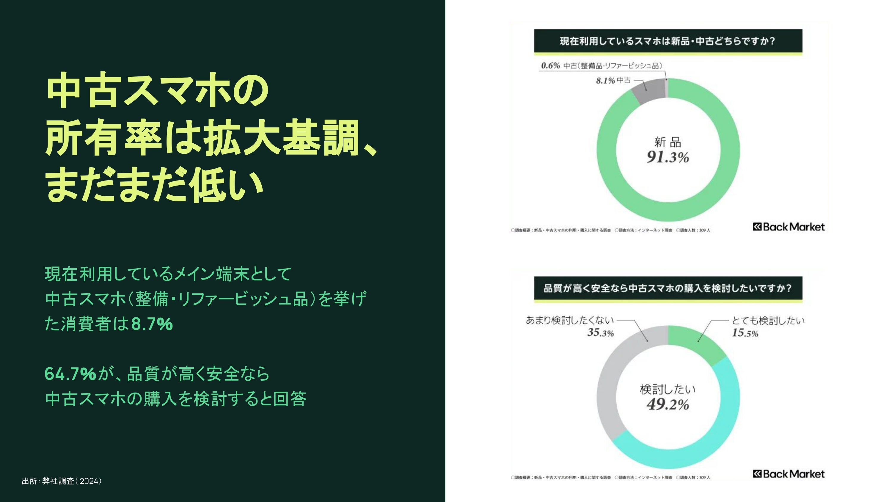リサイクル通信様の調査によると、2022年の中古・リファービッシュ市場は約2.9兆円に拡大し、2009年以降13年連続で拡大しています。資源価格の上昇や円安の進行を背景に物価が上昇したことで、新品よりも割安なリユース品が注目を集め始めています。Back Marketの調査によると、64.7%の人は品質が高く安全なら中古スマホの購入を検討すると回答しており、リファービッシュ品の需要拡大が期待されています。