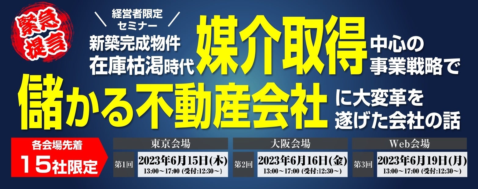そしてこの度、住宅需要の落ち込みや建材価格の高騰により、新築仲介依存からのビジネスモデル変革を余儀なくされている状況を踏まえ、経営者・経営幹部(役員)限定として、『媒介取得中心の事業戦略構築セミナー』を開催することにいたしました。