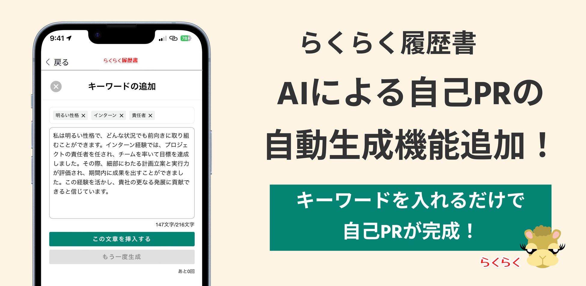 Ann株式会社(代表取締役CEO:山田元太郎、所在地:東京都新宿区、以下:当社)は、本日、「らくらく履歴書」というWebやアプリで簡単に履歴書や職務経歴書が作成できるサービス新たな機能として「自己PRの自動生成機能」を追加したことを発表いたします。この新機能により、ユーザーは簡単なキーワードを入力するだけで、プロフェッショナルな自己PRを迅速に作成することが可能になります。