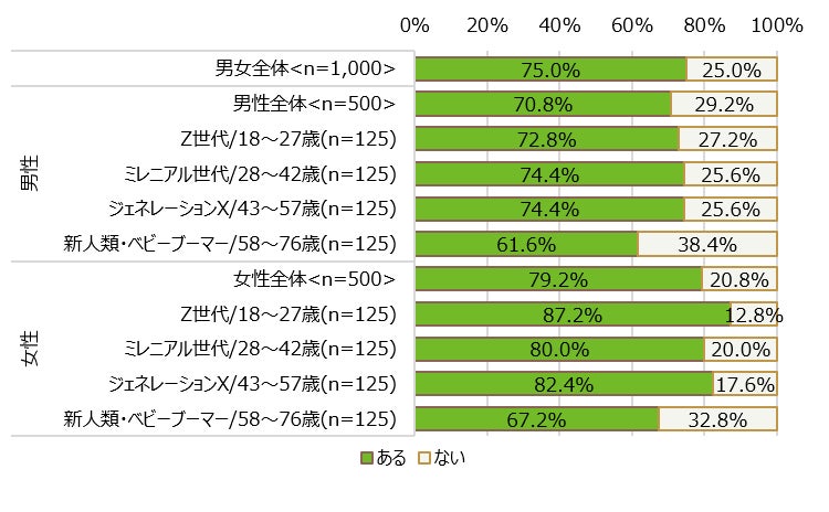 全世代の75%が仕事や家族、自身の悩みがあると回答。一方「不安・ストレス・悩みを誰かに相談する」は51.7%にとどまる。カウンセリング経験は全体の34.8%、Z世代女性では52%と最多に。