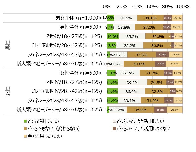 この傾向は男女共に若年層ほど多い傾向にあり、Z世代男性では合わせて51.2%、Z世代女性では合わせて53.6%と半数以上がより活用したいと考えていることが分かりました。