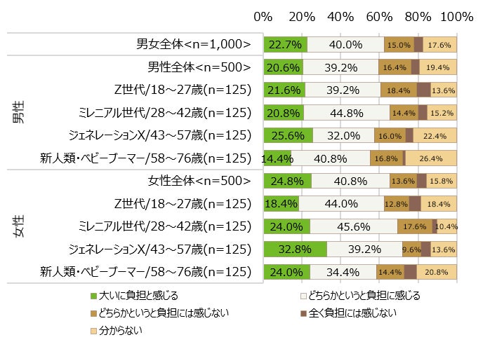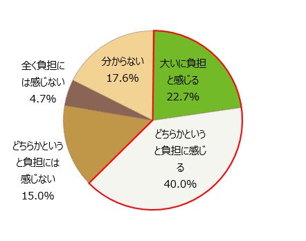 メンタルヘルスケアにかかる費用を負担だと感じるかを聞いたところ、全体の22.7%が「大いに負担と感じる」と回答。「どちらかというと負担に感じる」と回答したのが40.0%で、合わせると6割を超える方が負担だと感じていることがわかりました。
