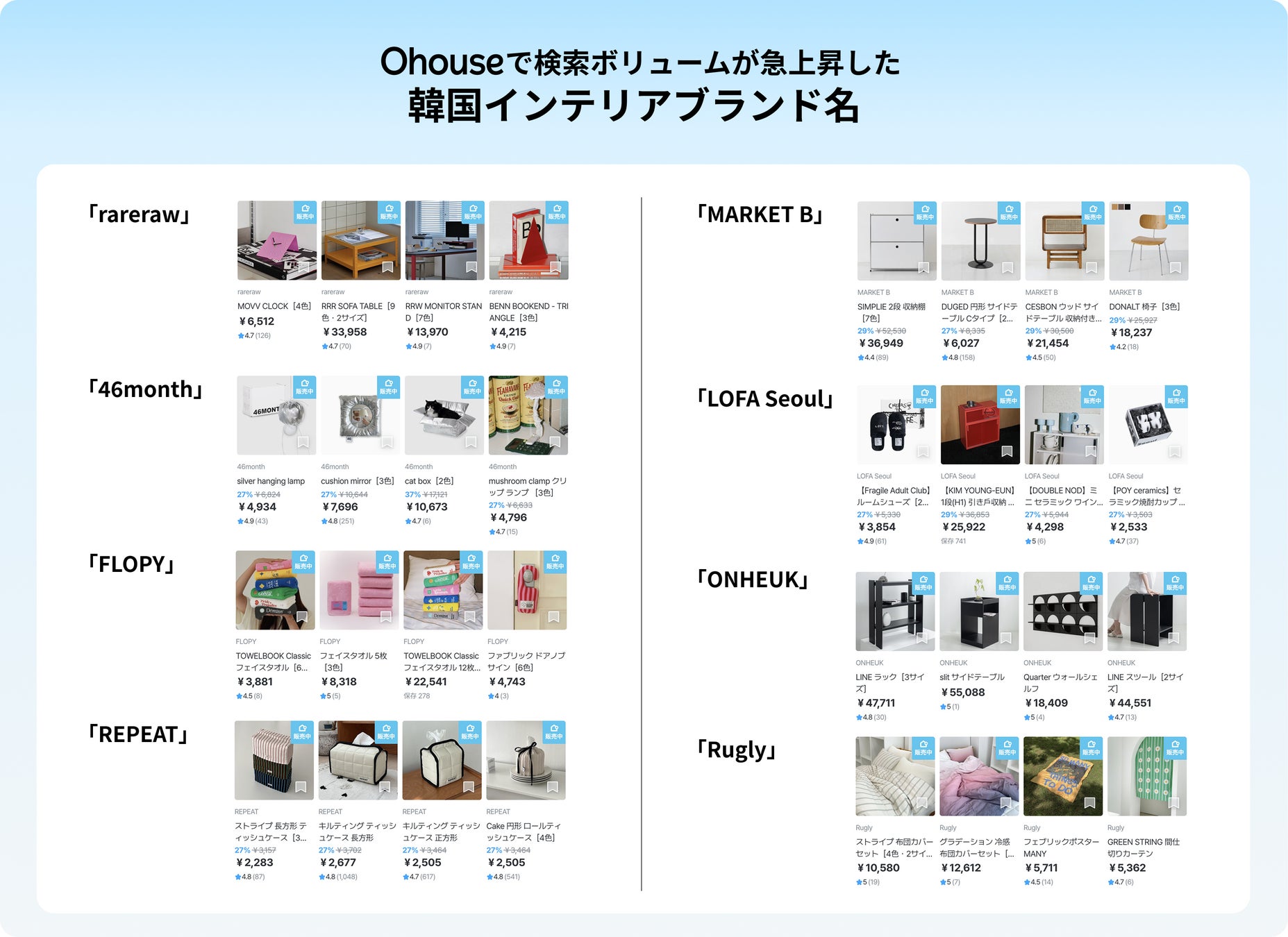 2024年は「IKEA」「ニトリ」「無印良品」のブランド3強が検索上位を占めていましたが、2024年10月のOhouseコマースオープン以降、2位以下の順位が激変。Ohouseが販売している韓国ブランドの名前(rareraw、MARKET B、46month、LOFA Seoul、FLOPY、ONHEUK、REPEAT、Rugly)が8つもランクインしました。