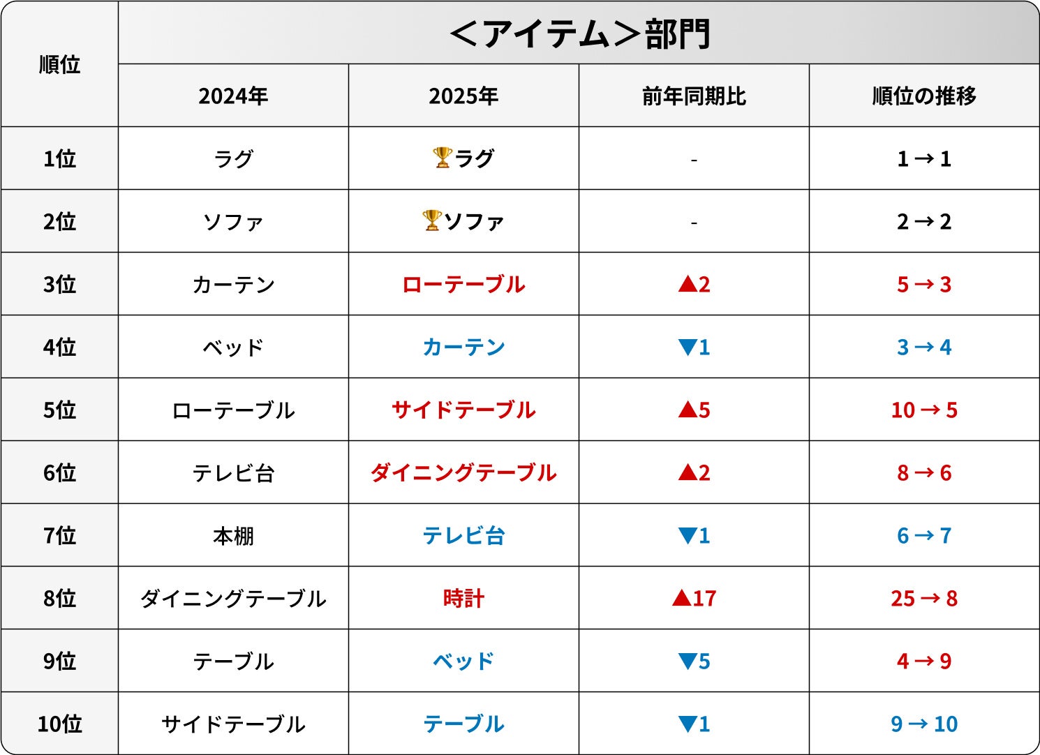 <アイテム部門>「ラグ」「ソファ」がトップ維持、「テーブル」ニーズが細分化