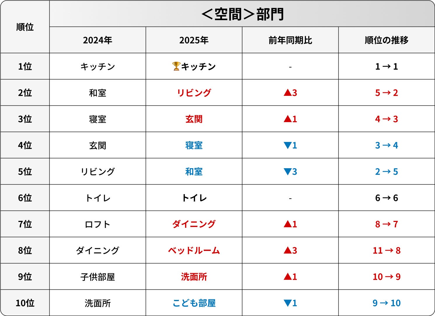 <空間部門>「寝室」/「ベッドルーム」が「キッチン」を抜き実質トップに