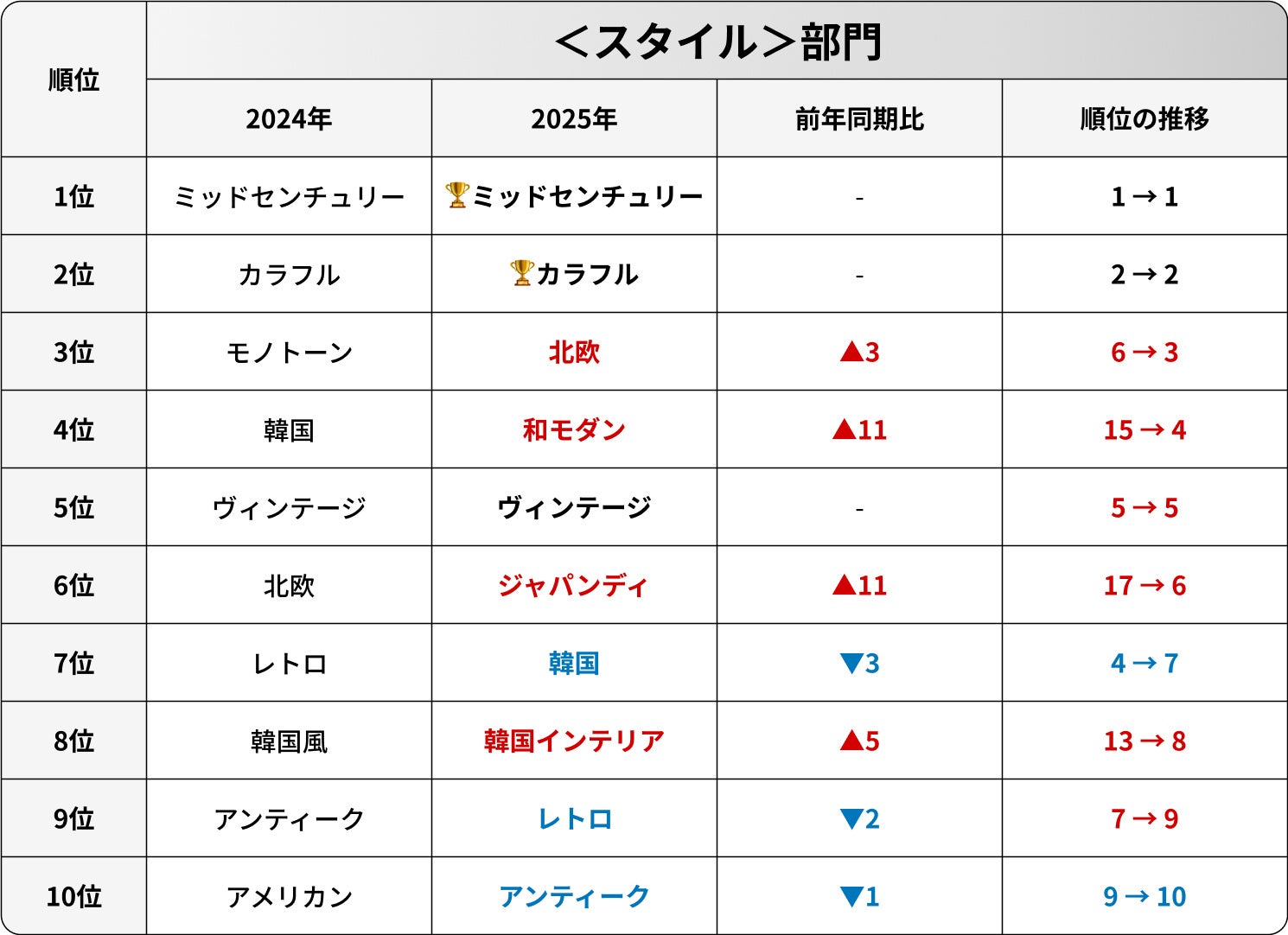 他部門に比べて順位変動が大きかったスタイル部門では、「ミッドセンチュリー」と「カラフル」スタイルが順位を変えず1位と2位を維持。和の要素を取り入れた「和モダン」「ジャパンディ」スタイルのキーワードが上昇しました。