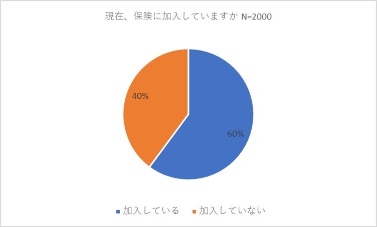 初めに全員に対し、「現在、保険に加入していますか」と質問を行いました。その結果、60パーセントの方が「加入している」、40パーセントの方が「加入していない」と回答しました。