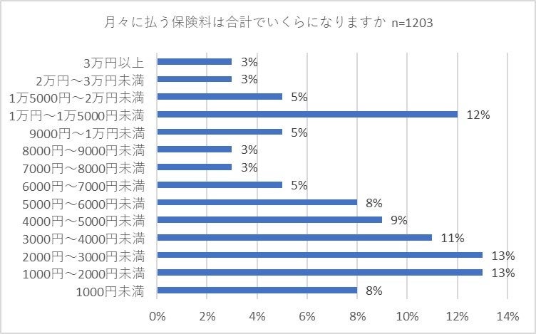 続いて「月々に払う保険料は合計でいくらになりますか」と質問したところ、「1,000円~2,000円未満」と「2,000円~3,000円未満」がともに13パーセントでトップに並びました。以下、「1万円~1万5,000円未満」が12パーセント、「3,000円~4,000円未満」が11パーセントで続きました。全体的に見ると「5,000円未満」が54パーセントと過半数の回答を集めました。