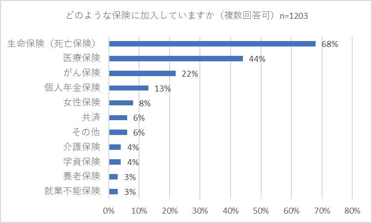 次に前設問で保険に「加入している」と回答した1,203人の方に「どのような保険に加入していますか」と複数回答可で尋ねたところ。「生命保険(死亡保険)」が68パーセント最も多くの回答を集めました。2位には「医療保険」(44パーセント)、3位には「がん保険」(22パーセント)が入り、さらに「個人年金保険」(13パーセント)、「女性保険」(8パーセント)が続きました。