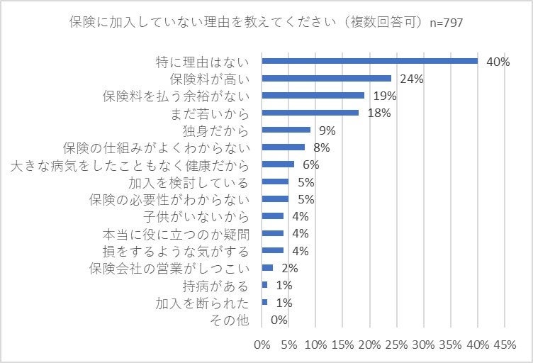 最後に保険に「加入していない」と回答した797人に「保険に加入していない理由を教えてください」(複数回答可)と質問しました。「特に理由はない」との回答が40パーセントで最多となりました。具体的な回答の中では「保険料が高い」(24パーセント)、「保険料を払う余裕がない」(19パーセント)、「まだ若いから」(18パーセント)が多くの回答を集めました。保険に加入していない理由として、経済的な要因を挙げる方が多かったことがわかりました。