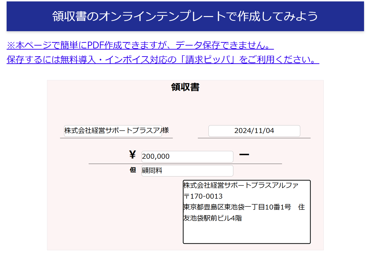 なお、「領収書テンプレート」は作成した領収書をPDF以外に保存できません。継続的に管理する場合は「請求ピッパ」をお使いください。