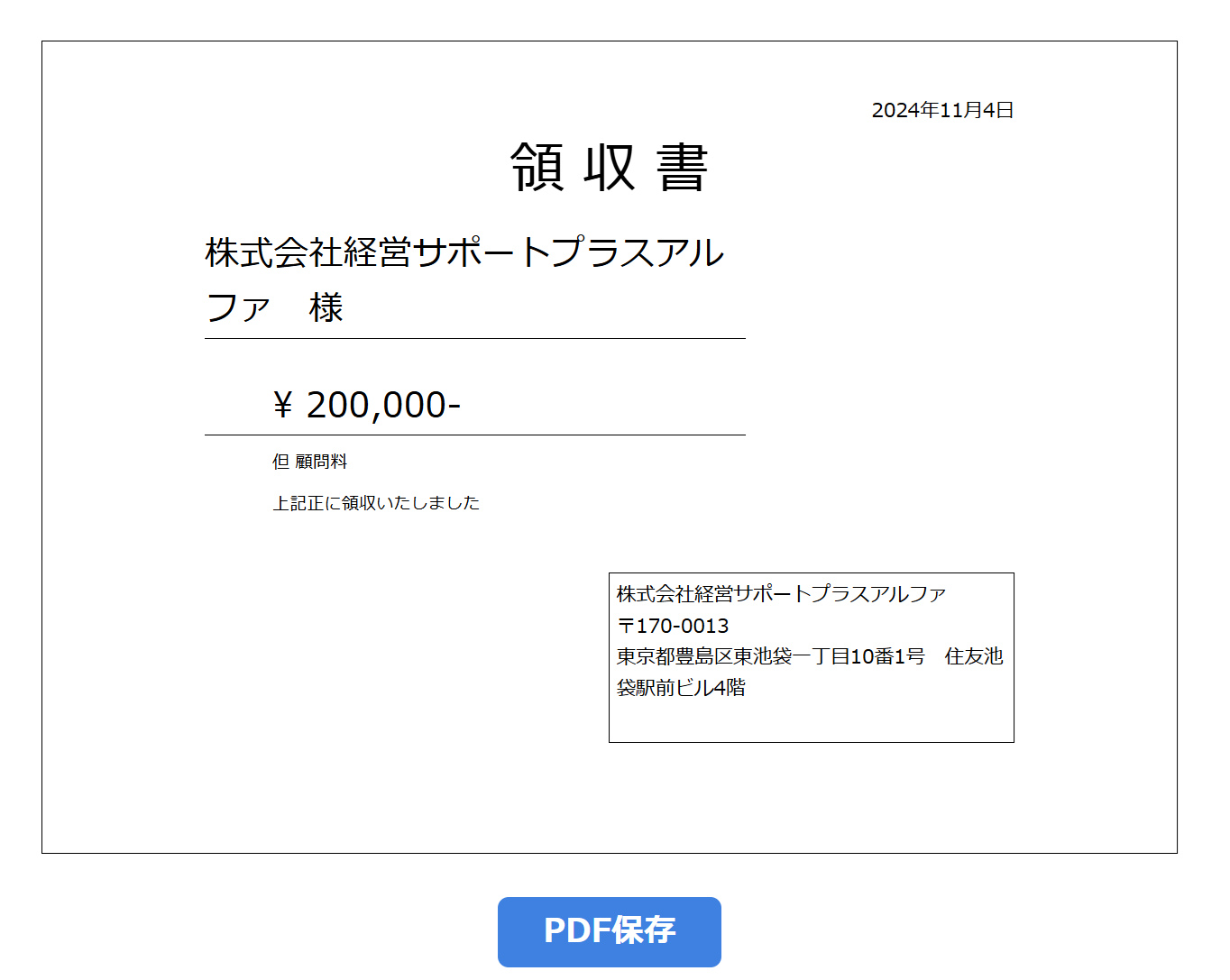 入力すれば、以下のとおり領収書が表示されるため、PDFで保存します。