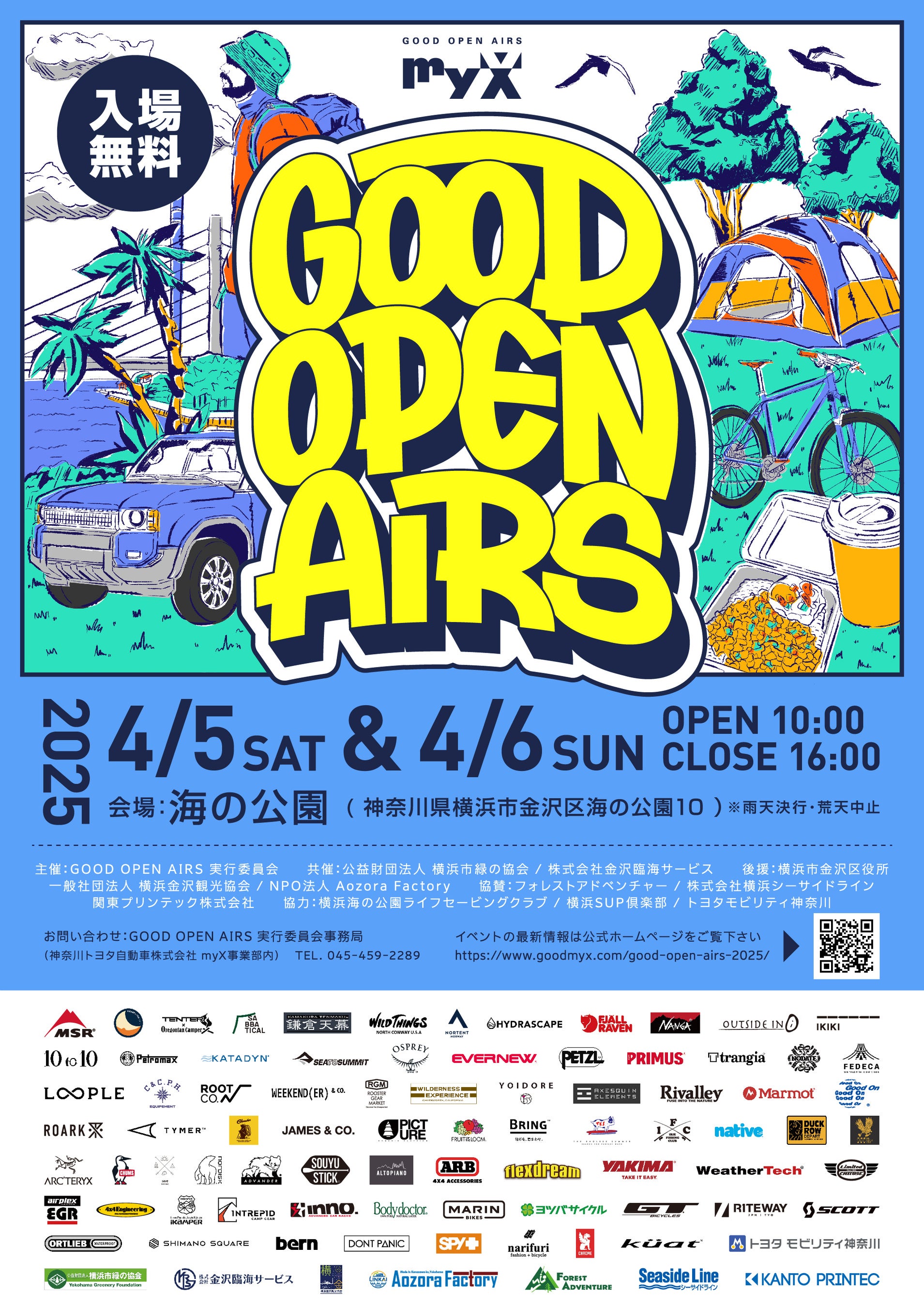 GOOD OPEN AIRS 実行委員会(運営事務局:神奈川トヨタ自動車株式会社 myX事業部内)は、2025年4月5日(土)・6日(日)の2日間、横浜・海の公園でアウトドアイベント「GOOD OPEN AIRS 2025」を開催いたします。