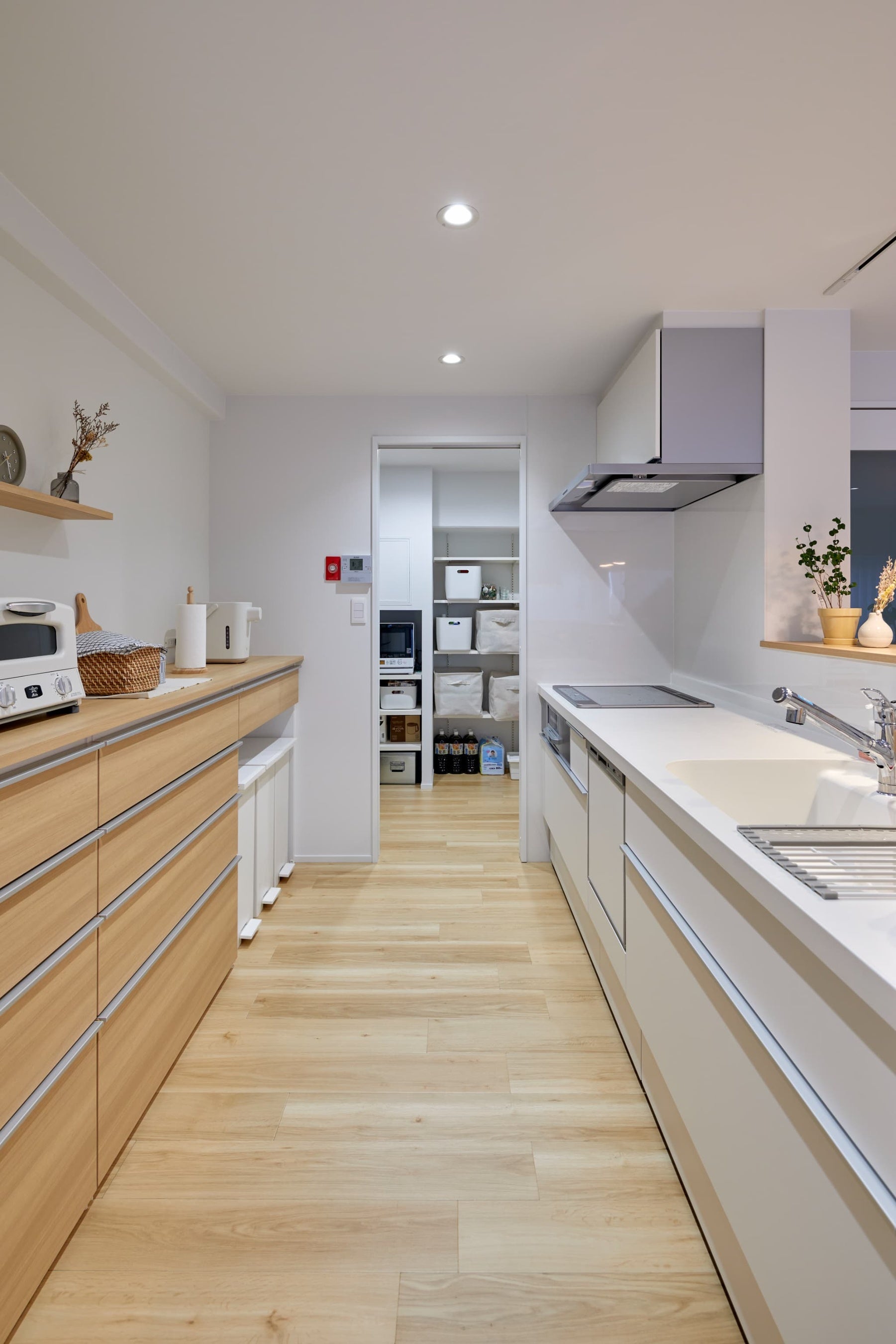 家族がどこにいても見渡せるように壁付けの個室キッチンから対面キッチンへと変更。玄関→パントリー→キッチンという動線計画で、買い物から帰ってきたときもスムーズに片づけられます。