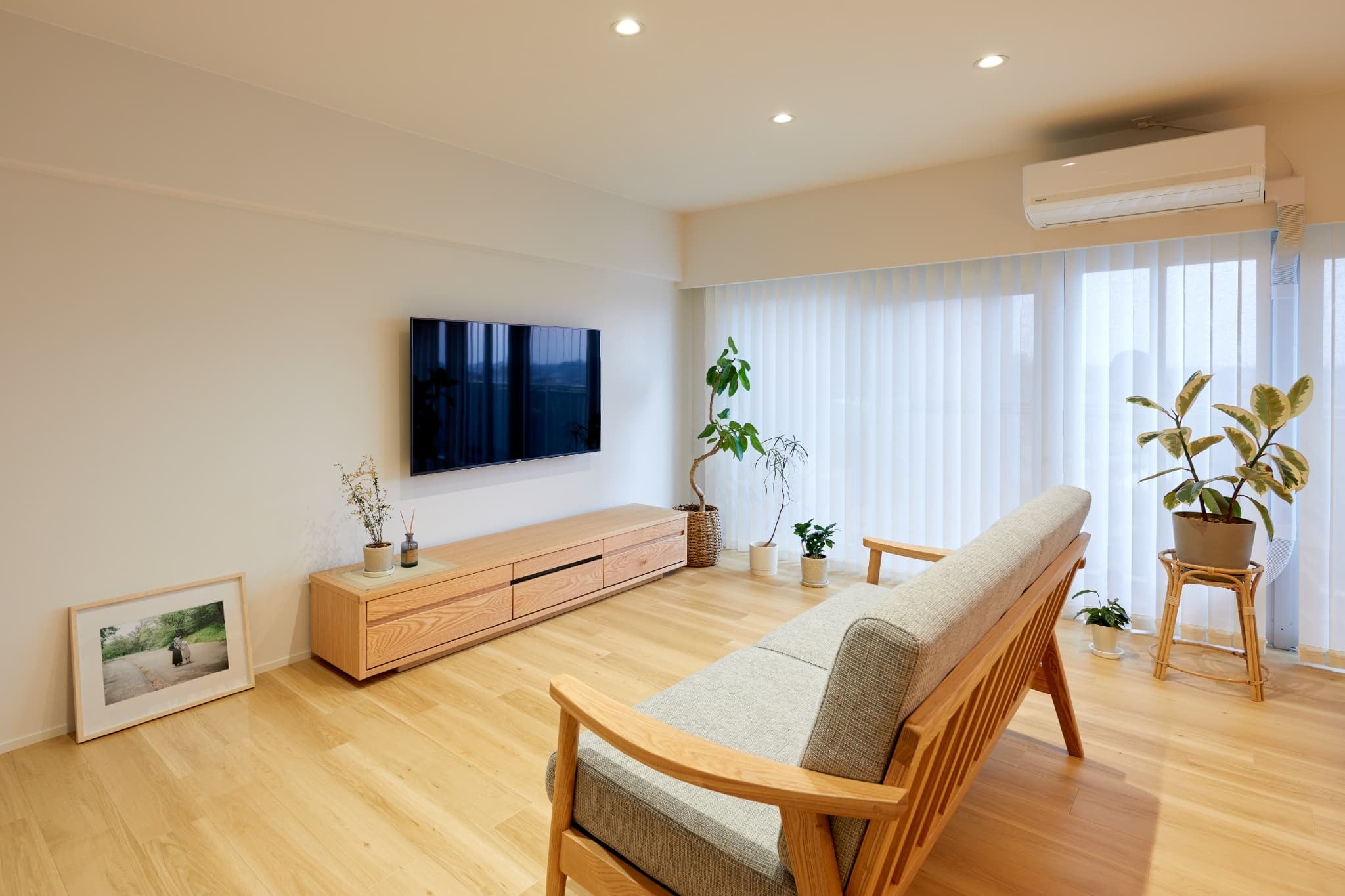 あまり多くの色を使わないようにして、家具や植物などで自分たちらしさを表現したのが施主様一番のこだわりポイント!床やクロスは色味が明るいもの、照明などもコードが白色の商品を選定。リノベーション後も植物を飾る楽しみが増えます。