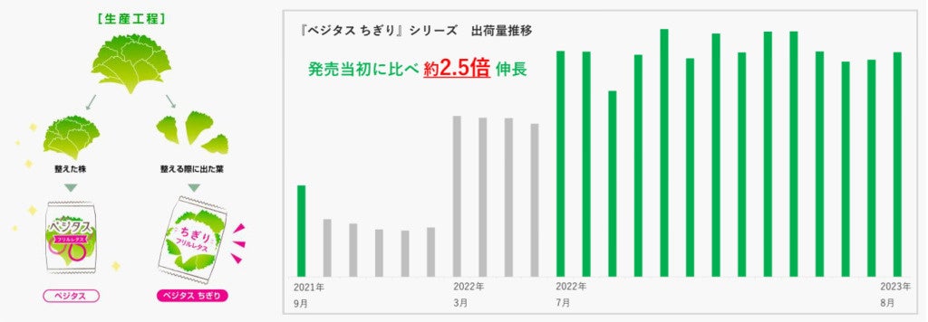農薬を使わずに栽培した『ベジタス』の栄養価に加え、「使いやすい少量タイプ」や「カット不要」といった利便性も向上し、多くのお客様からのご好評につき2回にわたり増産し、出荷量が約2.5倍に増加しています。