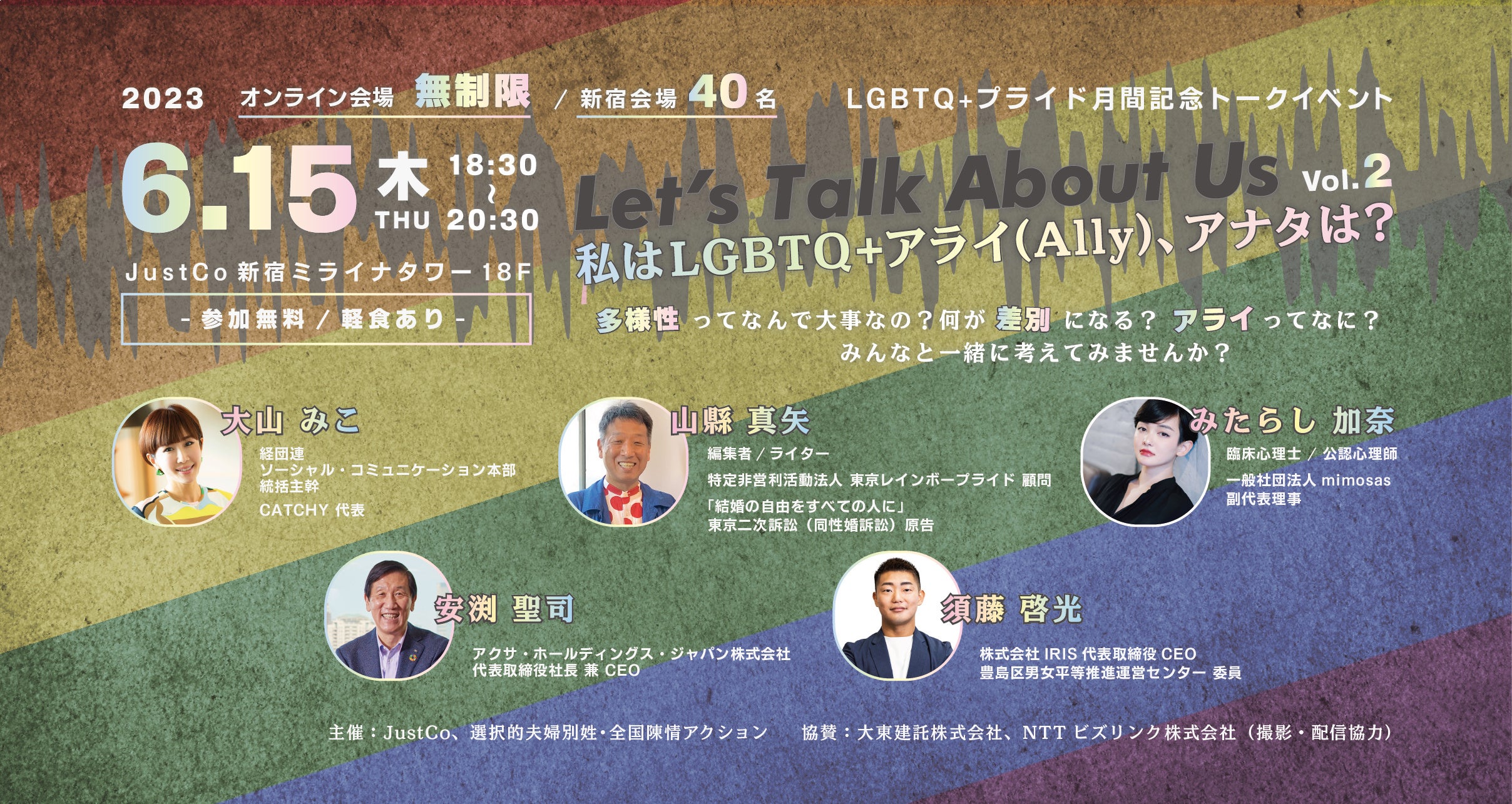 シンガポール発、プレミアムコワーキングスペース& シェアオフィスを展開するJustCoは、LGBTQ+の権利を啓発する活動月間「Pride Month(プライド月間)」を記念したトークイベント「Let`s Talk About Us Vol.2 私はLGBTQ+アライ(Ally)、アナタは?」を、2023年6月15日(木)にJustCo新宿ミライナタワー(18F)で開催します。前回に引き続き、選択的夫婦別姓・全国陳情アクションと共同開催するこのイベントは、大東建託株式会社とNTTビズリンク(撮影・配信協力)の協賛のもと、LGBTQ+の人たちがもっと自分らしく生きられる多様性のある社会の実現を目指して、LGBTQ+理解者・支援者「アライ(Ally)」を増やすことをテーマに掲げています。