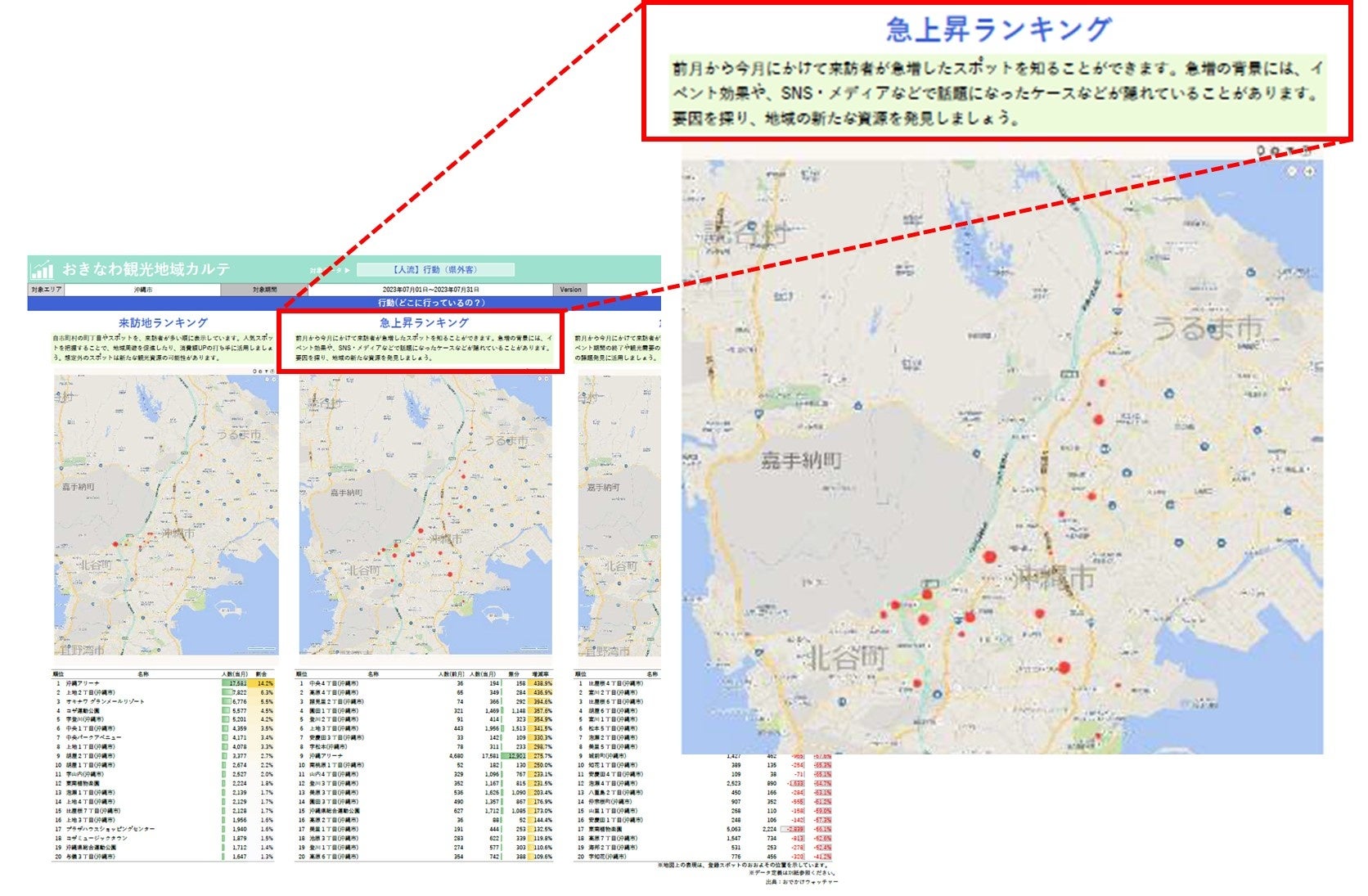 「おきなわ観光地域カルテ」は、ブログウォッチャーがデータ提供するデジタル観光人流モニタリングサービス「おでかけウォッチャー」を活用し、沖縄県における観光客(県外のみ)の人流データを分析、市町村別×月別にわかりやすく可視化した観光マーケティングレポートです。今年6月末よりプロトタイプ版(試作版)として一部地域にヒアリング・検証を行いながらSeason1リリース(年内予定)に向けた改善点の洗い出しを開始。この度、「おきなわ観光地域カルテ」を広く公開することで、より多くの地域に利活用頂きながら引き続き磨き上げに注力してまいります。