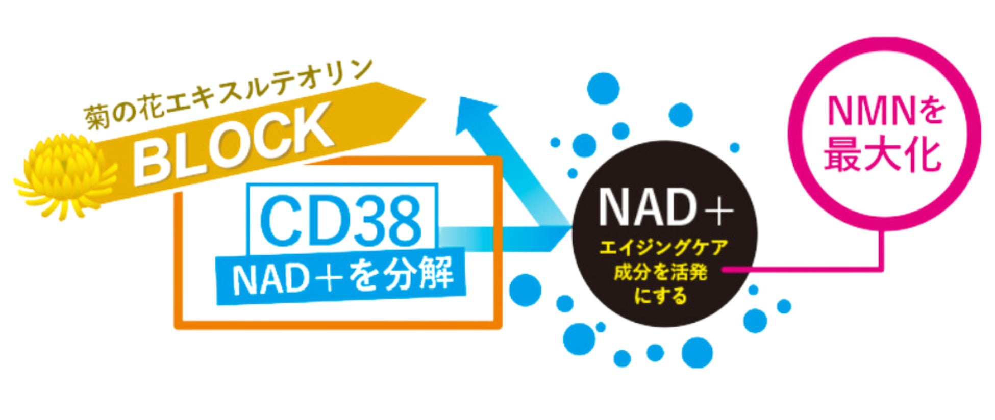 ネガティブな動きをするCD38酵素を減らしてくれるのが、ルテオリン(菊の花エキス)です。