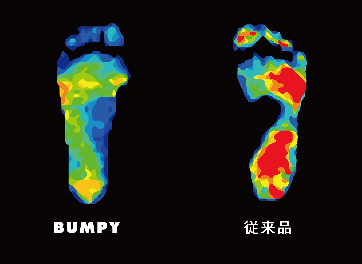 BUMPYの一番の特徴は、ブランド名の由来でもあるデコボコしたアウトソール。 重ね合わすことでズレにくく、コンパクトにまとめることができます。
