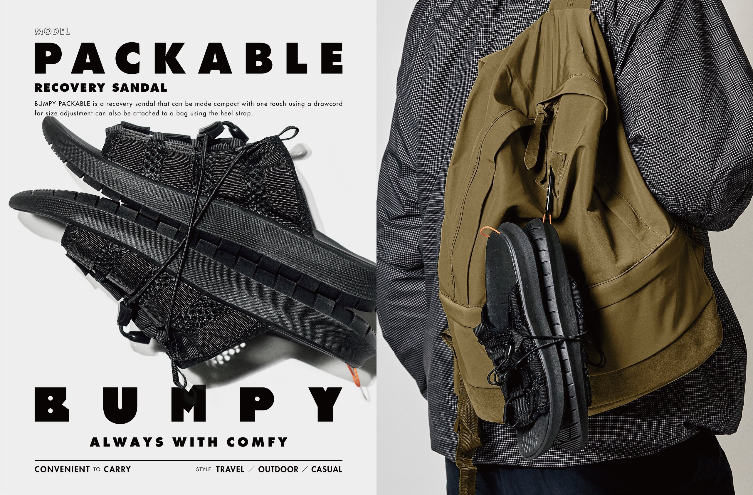 BUMPYのデビューシーズンでは、旅行やアウトドアに適した『PACKABLE』と、オフィスや室内でも使える『SABO』の2タイプを展開します。