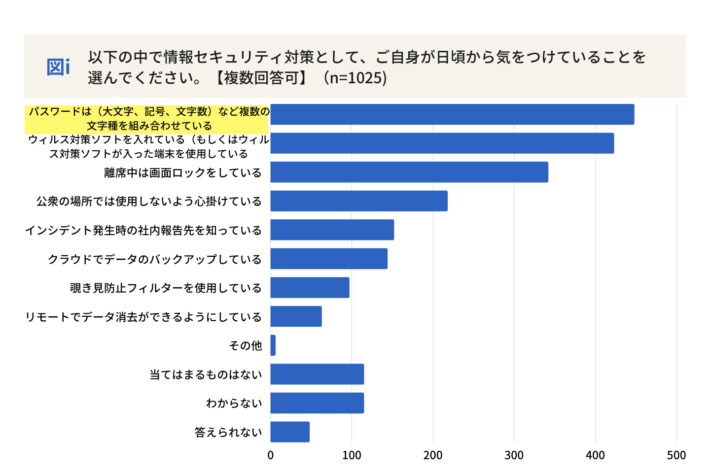 しかしその一方で、第3位には「どの行為も行ったことがない」がランクイン。さらに「情報セキュリティ対策として、日頃から気をつけていること」について尋ねたところ、第1位が「パスワードは(大文字、記号、文字数)など複数の文字種を組み合わせている」との回答でした。「パスワード管理は重要な情報セキュリティ対策である」との認識が深まっているものの、より一層の管理体制強化が必要であると考えることができます。