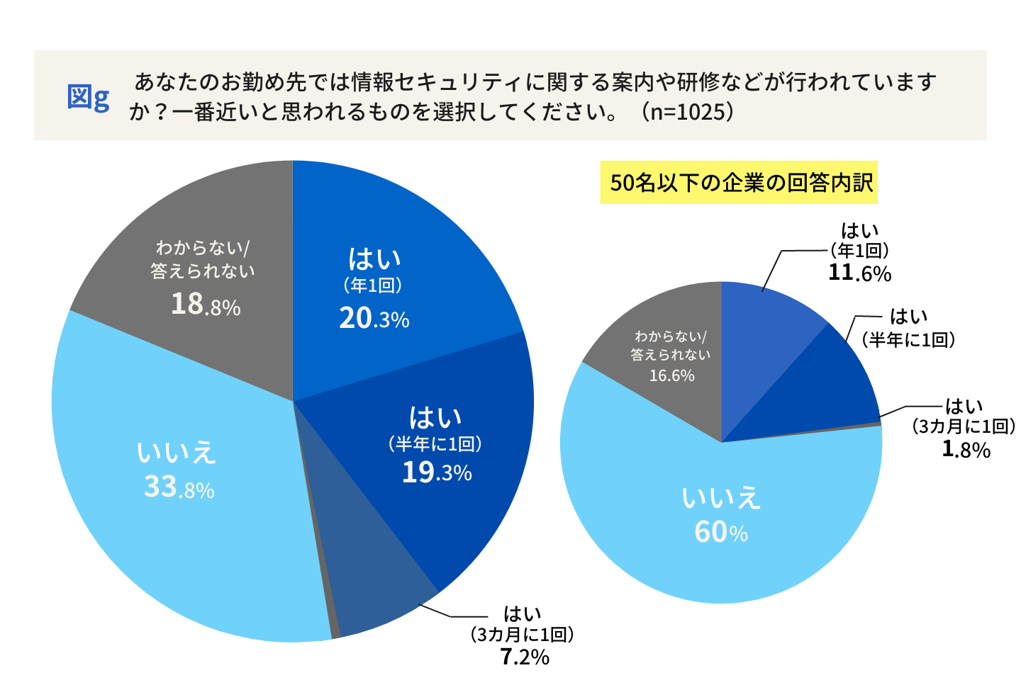 なお、「情報セキュリティに関する案内や研修などが行われているか」については「いいえ」が3割を超える結果となり、特に50名以下の企業では6割が研修を行っていないことが分かりました。
