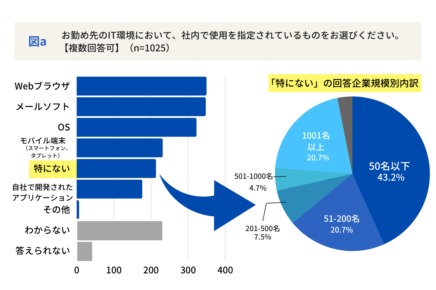 毎日のように流れる情報漏洩などのニュース。情報セキュリティの管理がますます重要になってきている今、最新の調査レポートをまとめました。まず「お勤め先のIT環境において、社内で使用を指定されているもの」を尋ねたところ第1位はWEBブラウザ、第2位はメールソフト、第3位はOSという結果になりましたが、第5位の回答に「特にない」がランクインしました。この回答を企業別でみてみると、43.2%が50名以下、20.7%が51-200名の企業となり、回答の6割を中小企業が占める結果となりました。