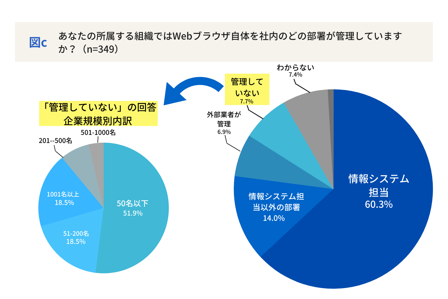 またこのWebブラウザの管理について、「社内のどの部署が管理しているか」尋ねたところ、「情報システム部」という回答が約6割となりました。しかし、企業規模別にみると、200名以下の中小規模の企業では、「Webブラウザを管理していない」「情報システム担当以外の部署が担当している」の割合が高いことから、中小規模の企業では管理する人員や時間が不足している様子が窺えます。そもそも背景には情報セキュリティの確保や不適切なコンテンツのアクセス制御などのために「Webブラウザの管理が必要である」という認識が不足している可能性も考えられます。