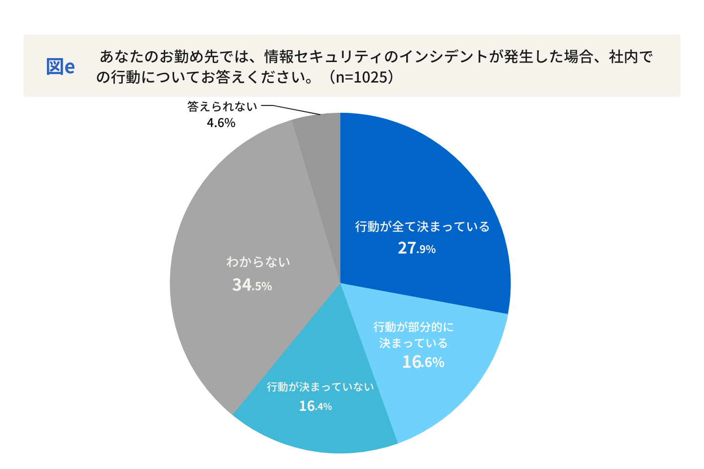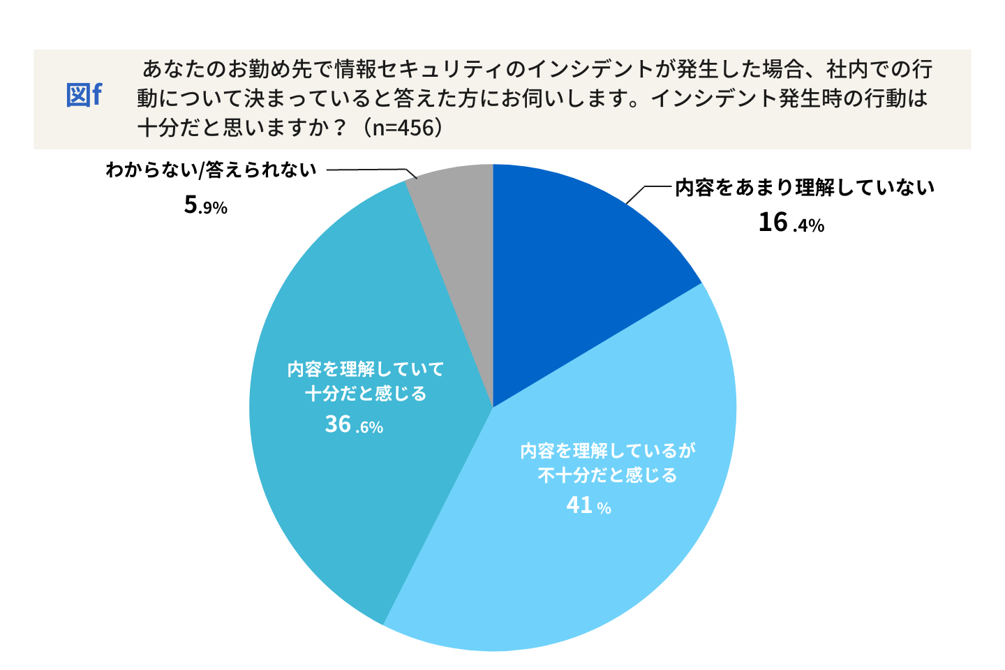 また図eで「インシデント発生時の行動は決まっている」との回答者に対し、「インシデント発生時の行動は十分だと思うか」と尋ねたところ、「内容を理解しているが不十分である」との回答が41%となりました。