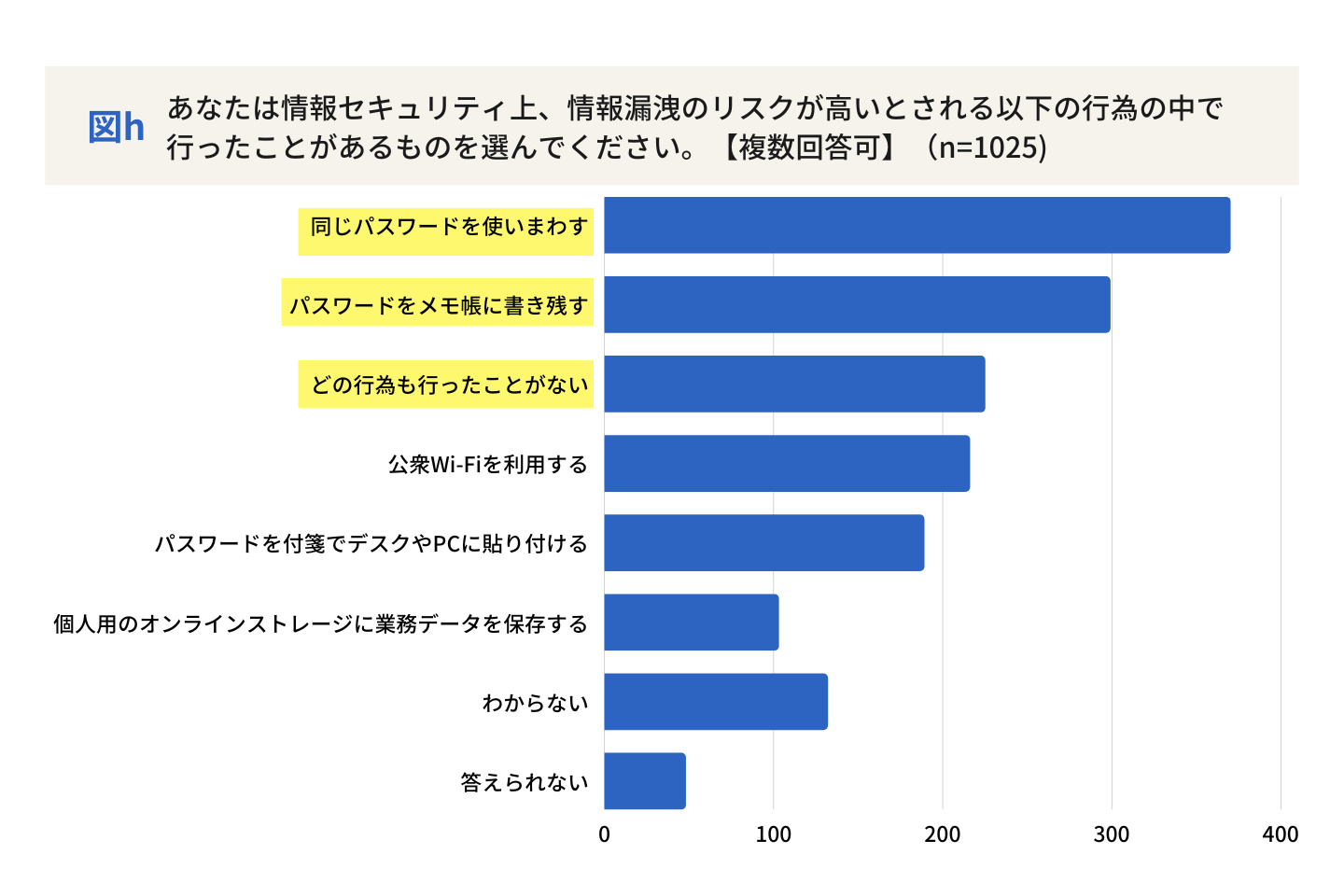 最後に「情報漏洩のリスクが高いとされる行動の経験」について質問したところ、第1位は「同じパスワードを使いまわす」、第2位「パスワードをメモ帳に書き写す」という回答で、パスワードにまつわる回答が上位に来ました。