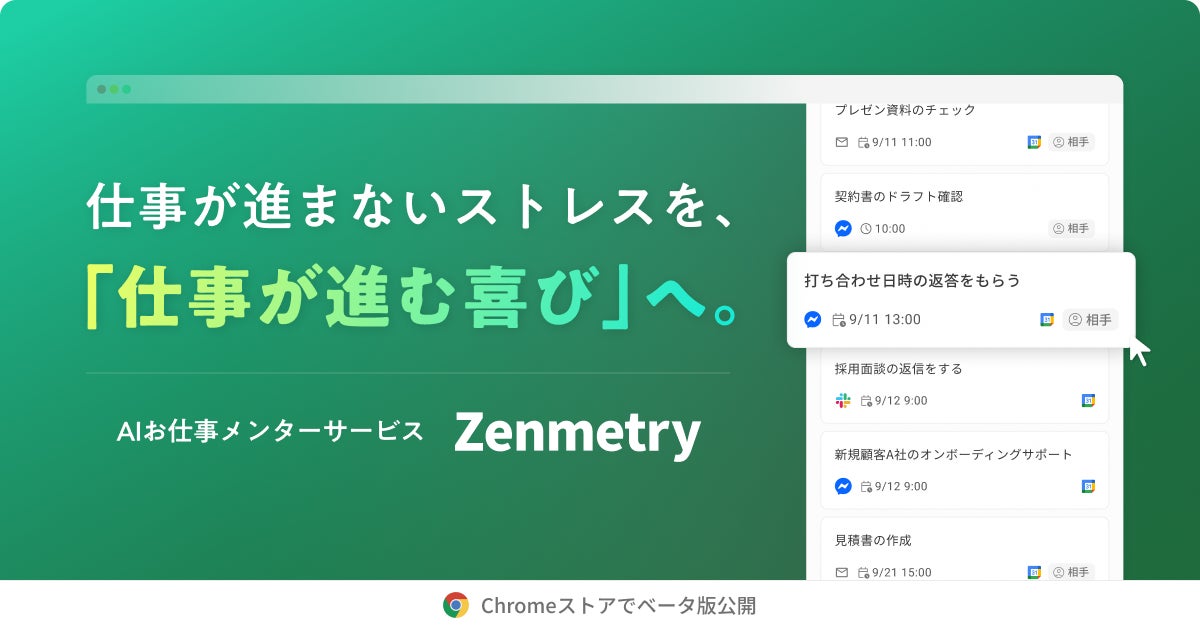 「人と仕事をなめらかに進化させ続け、大切なことに集中できる社会の実現へ」をミッションに掲げる株式会社Zenmetry(本社:東京都港区、代表取締役:長友好江、以下「ゼンメトリー」)は、5/1(木)より、AIお仕事メンターサービス「Zenmetry(ゼンメトリー)」のベータ版利用者を追加で100名を募集いたします。本サービスは、集中力が持続しにくい現代において、「集中」と「実行」を仕組み化することで、個人の能力に依存せず着実に成果を出すことを可能にします。