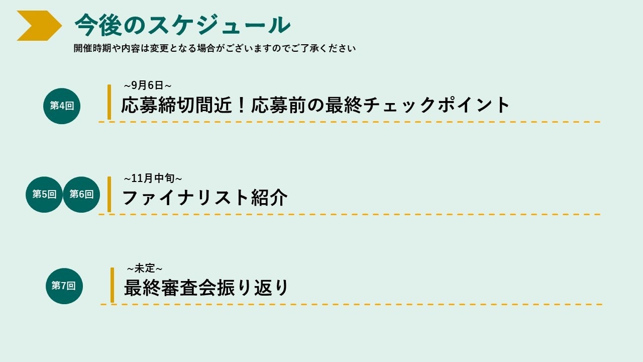 今後は最終審査会に向けたコンテンツを配信いたしますので、引き続きご注目ください。