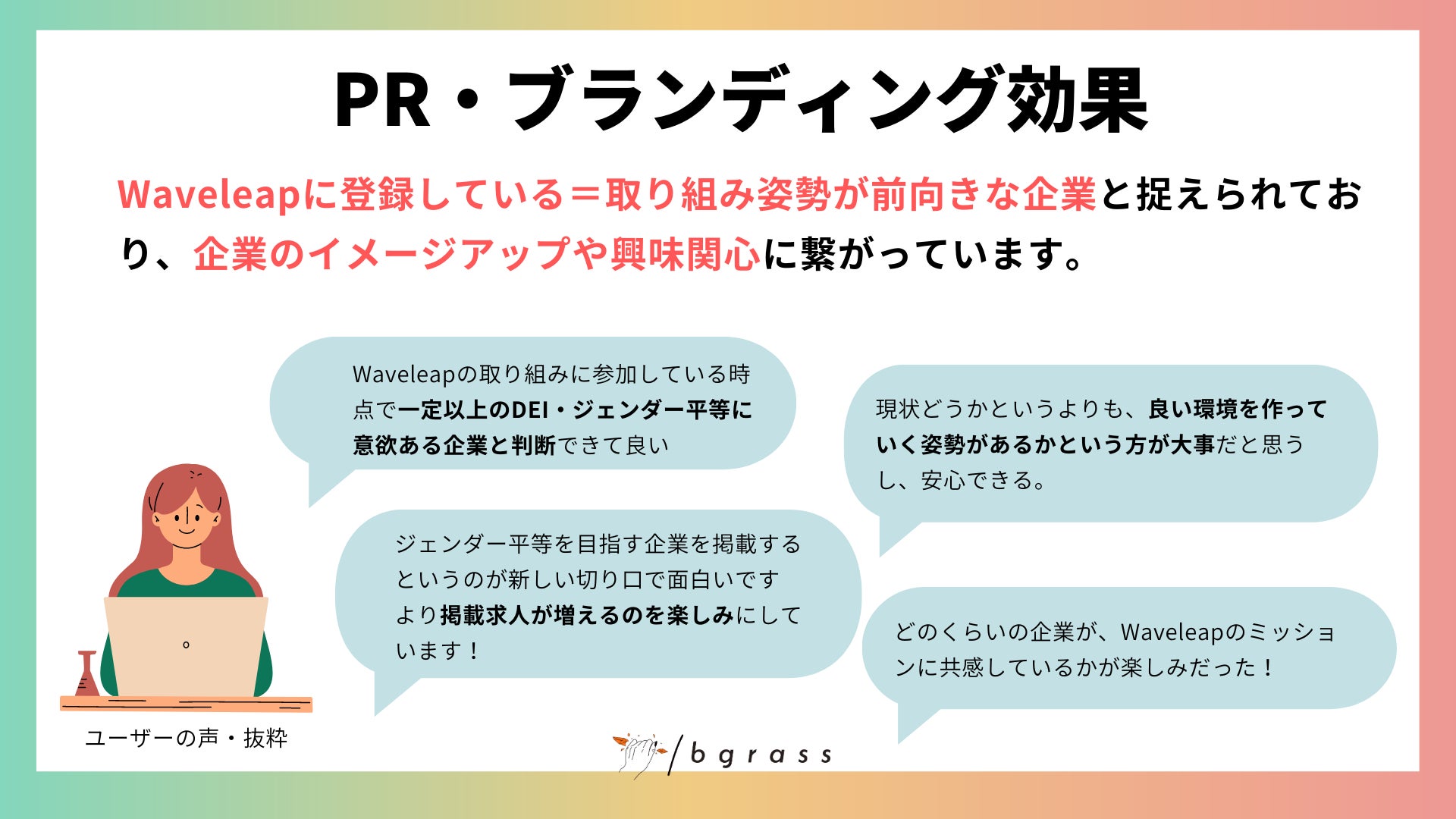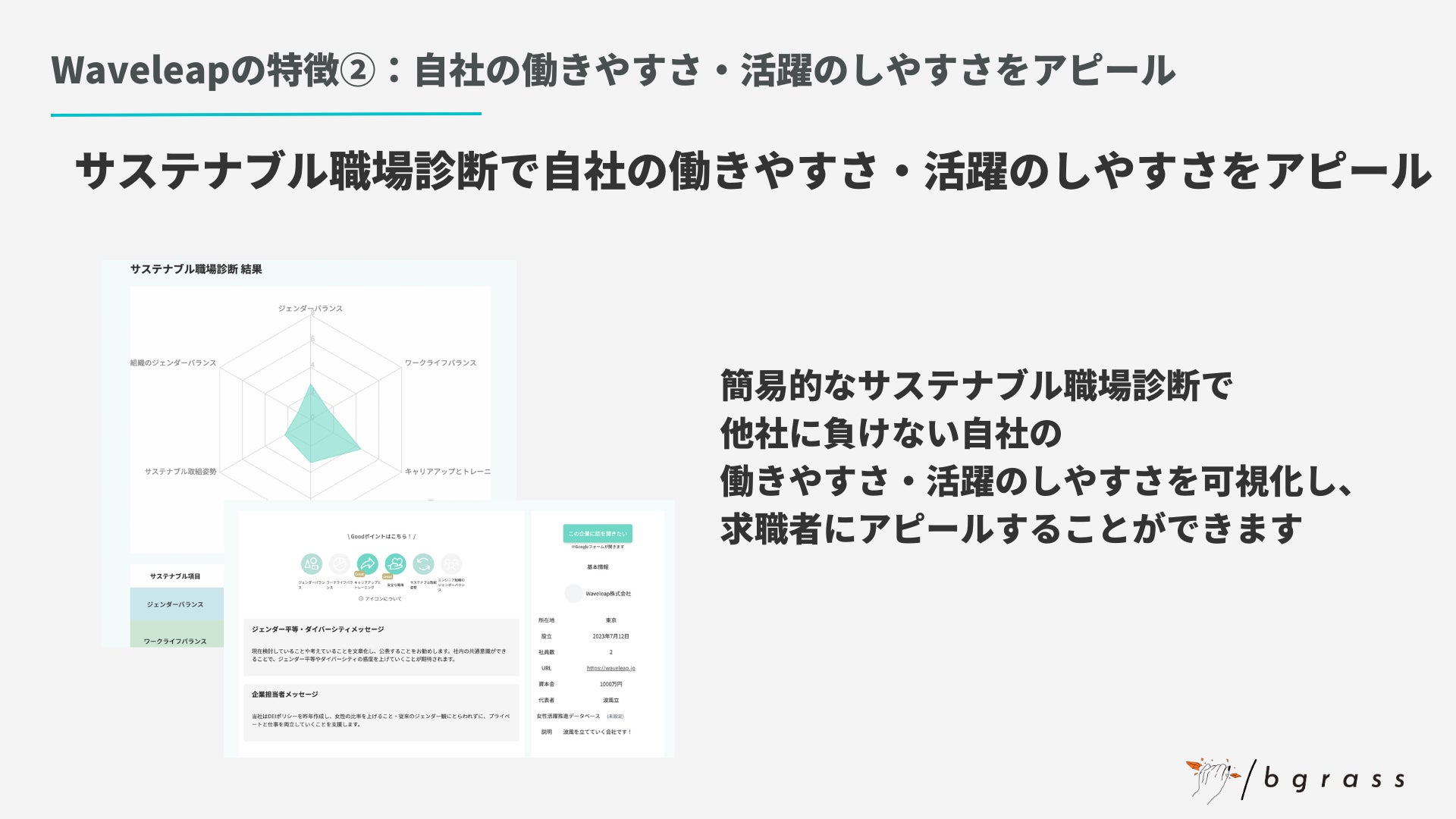 そこで、このミスマッチを解消するべく、bgrassが独自に作成した「サステナブル職場診断」の結果に基づき、働きやすさ・活躍のしやすさを軸に企業と求人を探すことのできるサービス「Waveleap」の開発に取り組んでいます。