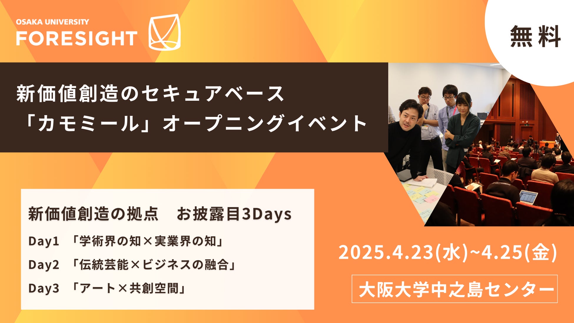 大阪大学フォーサイト(株)(本社:大阪府吹田市、代表取締役:松波 晴人)は、2025年4月大阪大学発祥の大阪・中之島に、新価値創造に挑戦する人達のオープンイノベーション拠点『カモミール』を開設します。