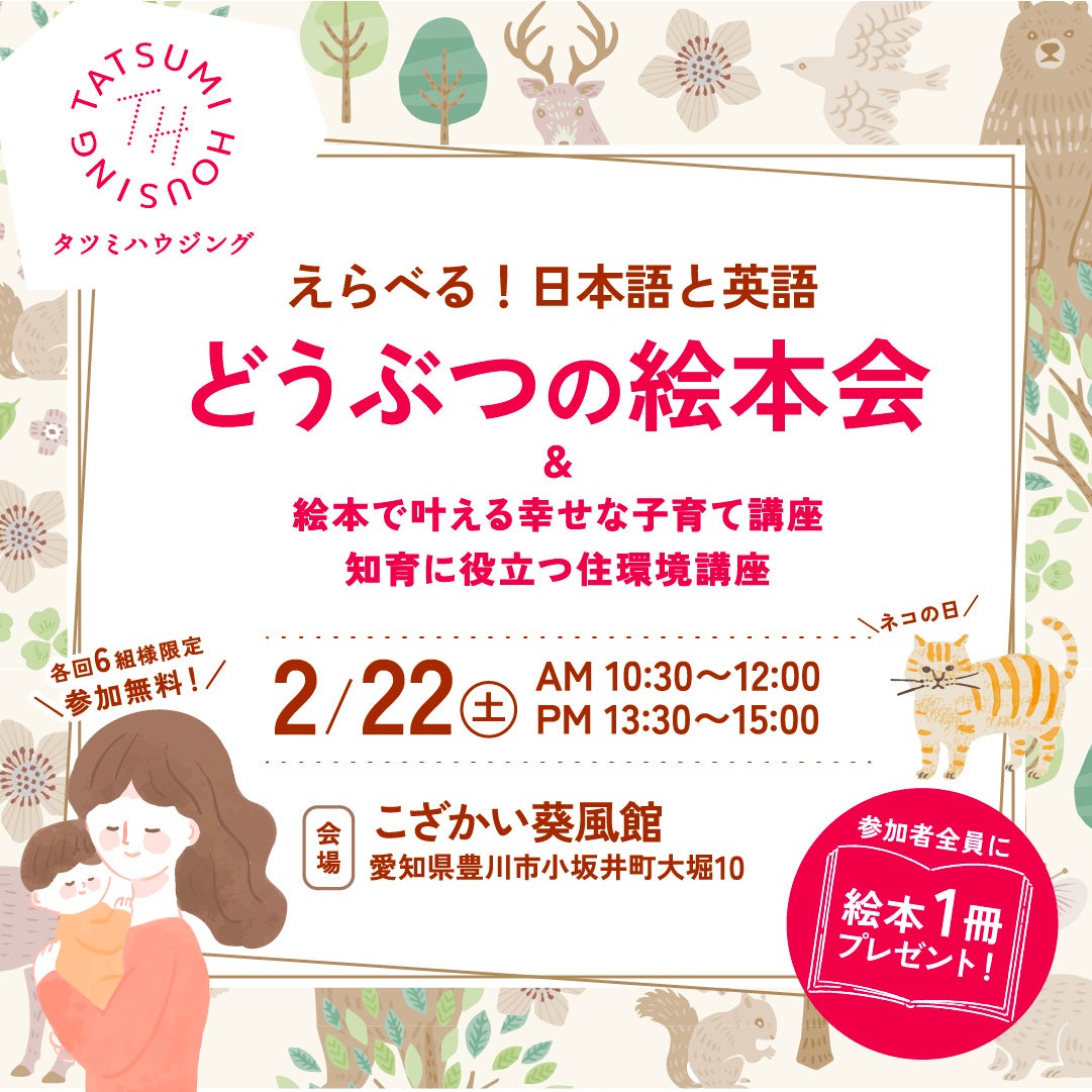 愛知県東三河地域で住宅の新築、リフォーム、不動産事業等を手掛ける株式会社タツミハウジング(本社:愛知豊川市伊奈町、代表取締役:佐宗樹弥)は、2月22日(土)にこざかい葵風館(豊川市)にて「どうぶつの絵本会」を開催いたします。
