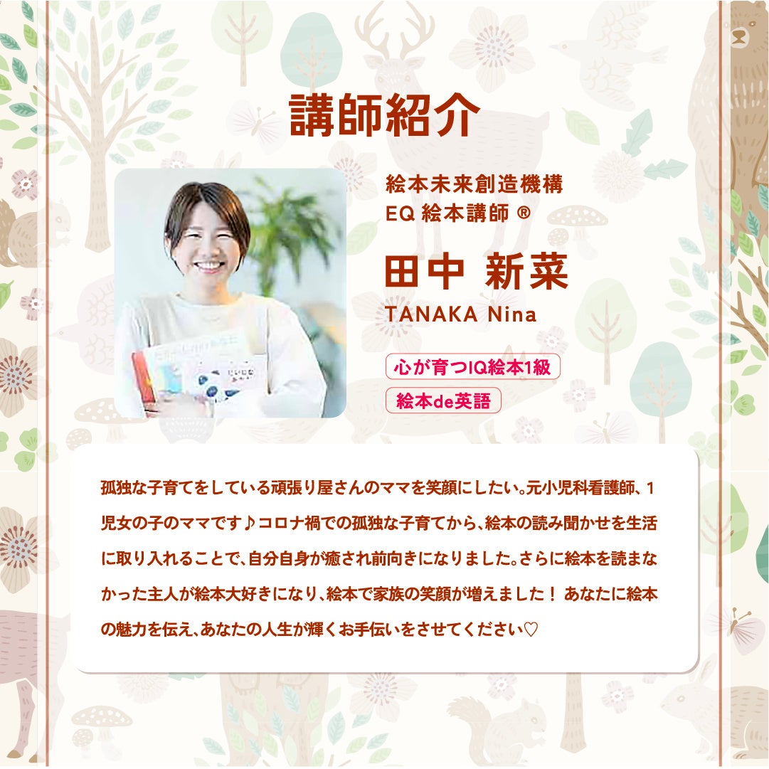 絵本の読み聞かせをたっぷり楽しんでいただいた後に、EQ絵本講師の田中新菜先生に絵本の読みかせのコツや、幸せな子育てをするためのポイントを教えていただきます。