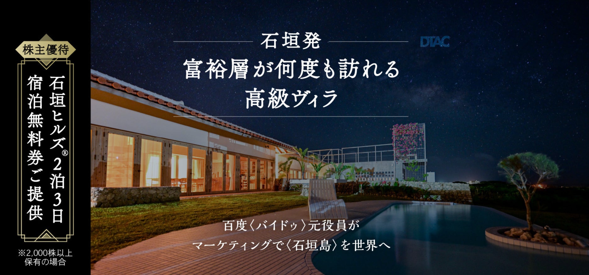 石垣島 高級リゾートヴィラ ブランド「石垣ヒルズ®」運営の株式会社DTAC、株式投資型クラウドファンディングで資金調達を開始