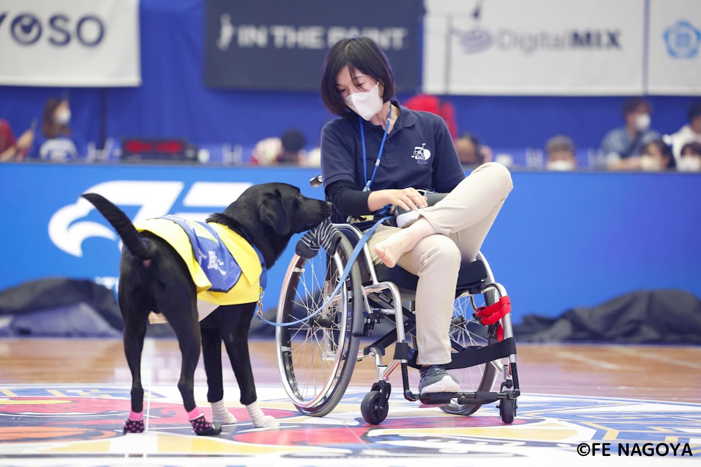 そのご縁から、2021-22シーズンにFE名古屋のホームゲーム会場にて初めて日本介助犬協会様のブースを出展いただき、取り組みのご紹介、チャリティーグッズの販売および募金活動などを展開しておりました。