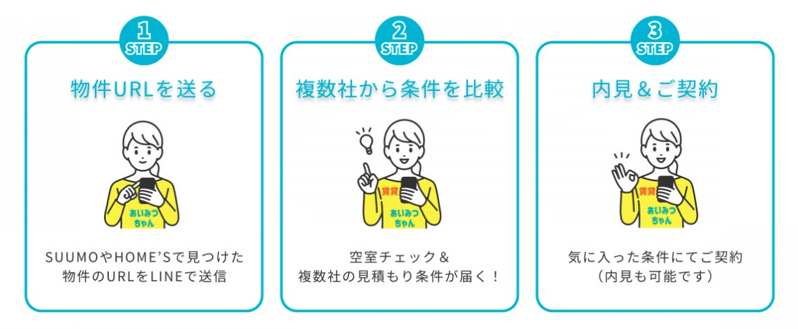 賃貸ポータルサイトに掲載されている、住みたいお部屋のURLを「賃貸あいみつちゃん」公式LINE(https://lin.ee/Ot8psOh)へお送りください。URLを送るだけで相見積もりを開始します。