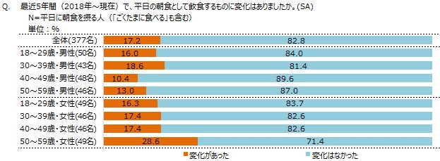 全体では17.2%が最近5年間で平日の朝食の内容に「変化があった」としました。この割合を属性別でみると50~59歳・女性(28.6%)で最も高く、40~49歳・男性(10.4%)で最も低くなりました。男性では50~59歳(13.0%)も2番目に低く、40~59歳の男性は平日の朝食内容について、保守的であることがわかりました。