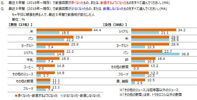 平日の朝食に関して、最近5年間における主な飲食物の飲食回数の変化を性別でみると、男性では米、ヨーグルト、コーヒー、牛乳、その他のジュース(自家製ジュースを除く)などで「多くなった」が「少なくなった」を上回りました。女性ではヨーグルト、シリアルなどで「多くなった」が「少なくなった」を上回り、パンは逆に「少なくなった」が「多くなった」を上回りました。ヨーグルトやシリアルがパンに取って代わる形となりました。